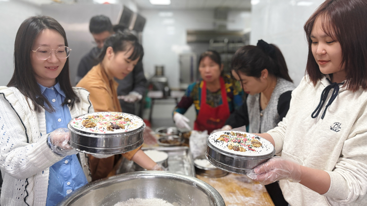 在实践环节,大家在面点师傅的协助下亲手制作重阳糕,糯米粉和黏米粉过筛后和面,然后在蒸笼里铺上湿纱布,先撒一层薄薄的和好的米粉,然后铺上一层配料,再撒一层米粉,如此反复,最后在顶层点缀一些蜜枣和核桃仁等做装饰,然后蒸制30分钟左右。出锅后趁热在表面刷一层桂花酱,既能增加香气,又能让糕点更有光泽。小伙伴们说:“每年都是买现成的重阳糕,第一次亲身体验这种传统手艺,感觉特别新奇,也非常期待自己亲手做的重阳糕”。