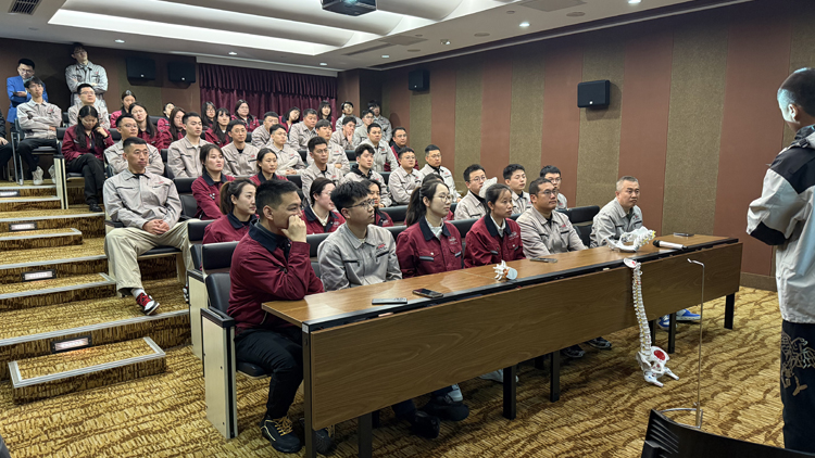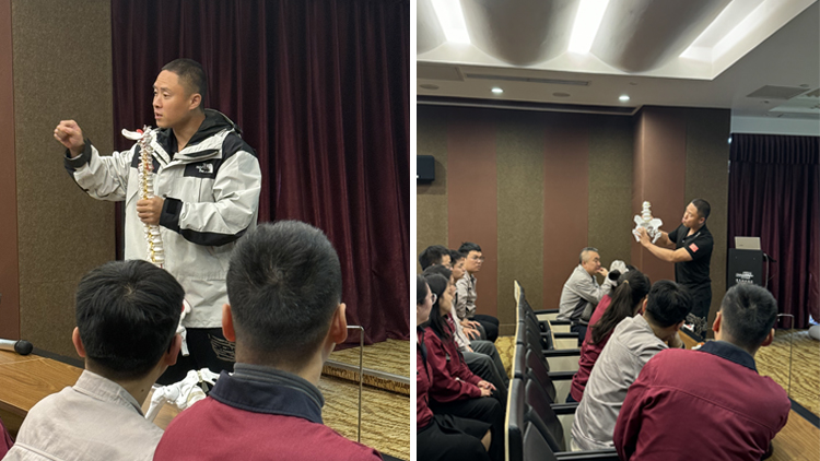 活动首站设在公司影音厅。指导老师开启了理论知识分享,生动讲解了骨骼和核心肌群的分布与功能。针对员工关心的问题,重点拆解了训练中的常见误区:如怎样避免腰部代偿,保护腰椎,提升训练效果等,用通俗易懂的语言将专业知识转化为"可操作的健康指南"。