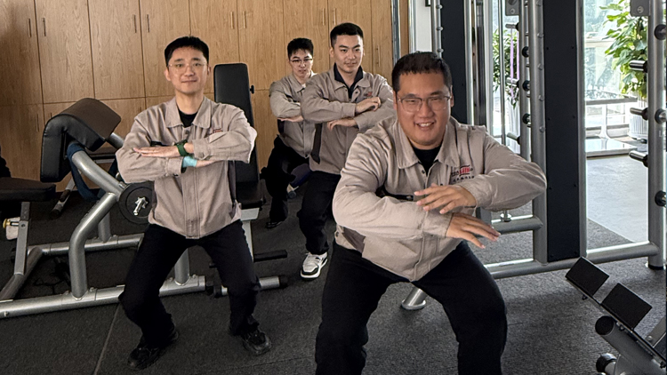 理论学习后,转场至公司活动室。男员工以"俯卧撑+蹲起"强化上肢与下肢力量,女员工以"平板支撑+蹲起"侧重核心稳定性与下肢耐力。在老师的指导下,大家逐渐找到了发力点和平衡感,细致入微的指导让每位参与者都收获满满。